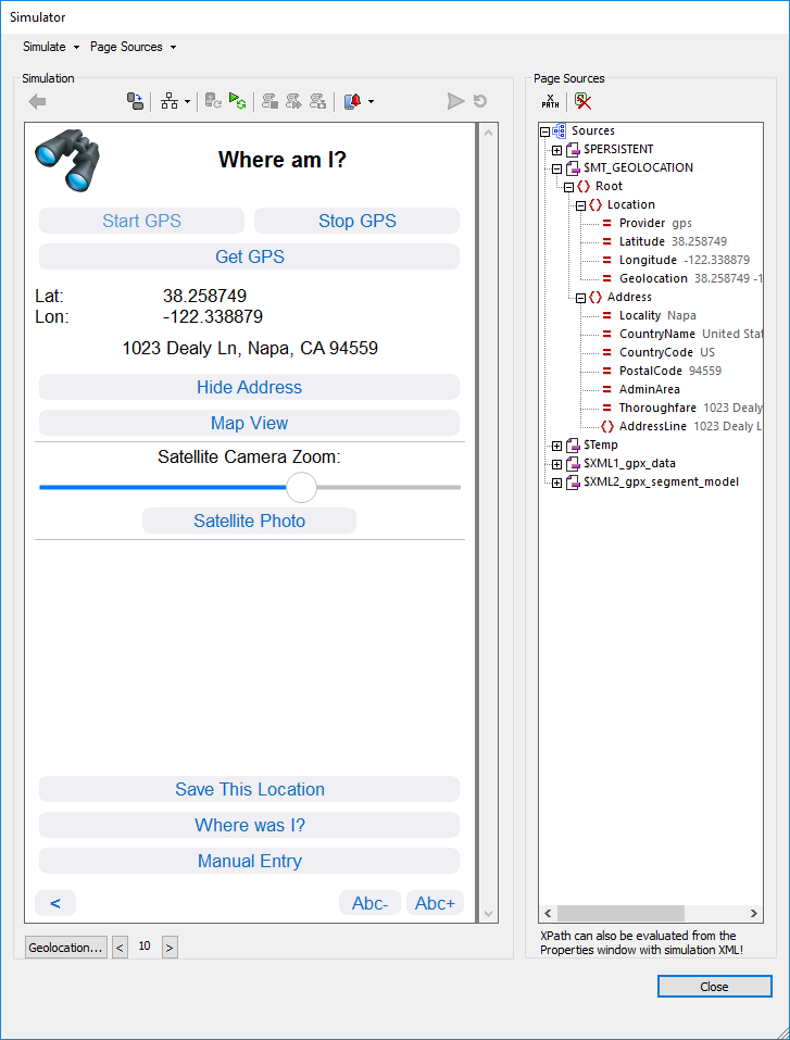 Two issues arise immediately: the Simulator does not report true GPS coordinates. Instead, it uses a data file to simulate movement of the mobile device and updated GPS coordinates. And, the Map View button in the app opens Bing maps on the Windows workstation running the Designer, whereas it should open Apple Maps as the default mapping application on an actual iPhone.
