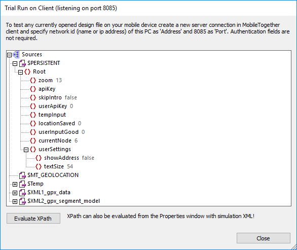 We could simply click the Abc+ button to increase the text size and require end-users to do the same, but that would be a clumsy and not very user-friendly solution. Investigating further, we can use the Trial Run on Client window in the Designer to see the data tree for the app as it runs: