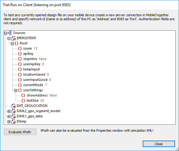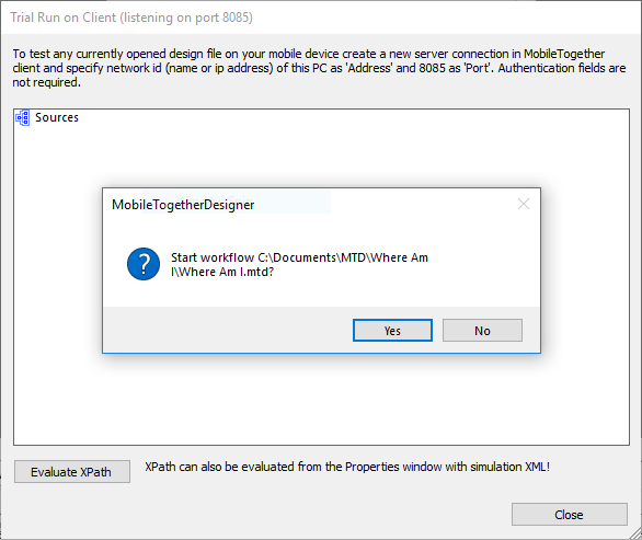 Trial Run on Client has very modest requirements: the mobile device for testing has the MobileTogether Client app installed, the mobile device and MobileTogether Designer workstation are on the same network, and the Designer workstation network address is configured as a MobileTogether Server on the mobile device.