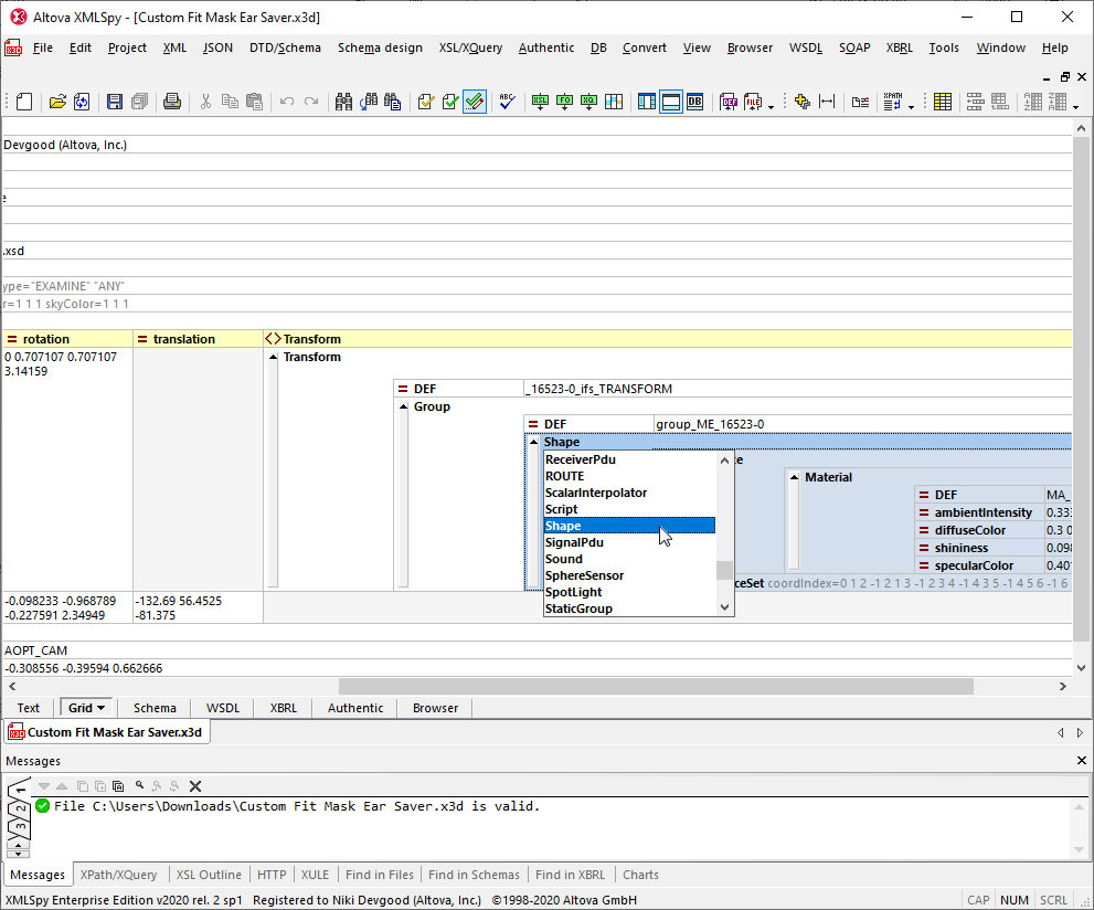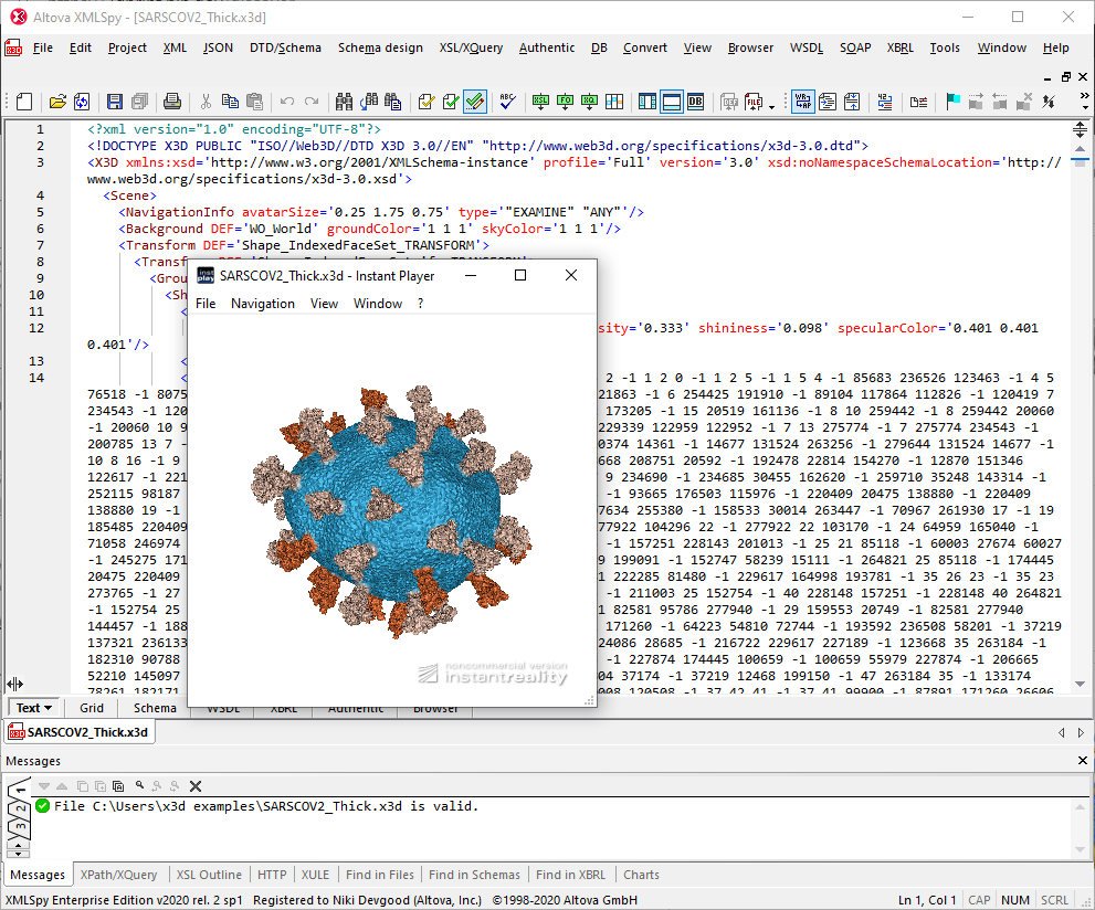 It takes that much complexity to accurately describe anything from a precisely manufactured machine part to a richly textured virtual environment, especially considering lighting, texture, and point of view! XMLSpy, the world’s most popular tool for modeling, editing, transforming, and debugging XML and JSON related technologies, supports .x3d files. XMLSpy offers standards-based tools for anyone who may need to examine, exchange, consume, or validate .x3d files. Let’s look at some examples.