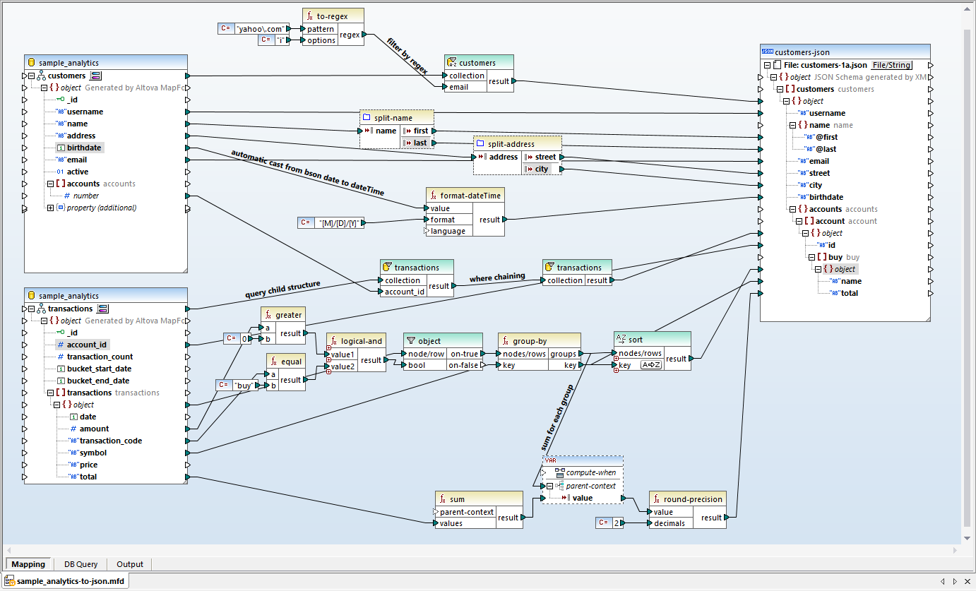 Shown below is a complete data mapping from the NoSQL MongoDB sample_analytics database. This mapping extracts a subset of the binary JSON (BSON) data from multiple collections, combines, filters, transforms, and sorts the data, then exports the result as a single JSON document.