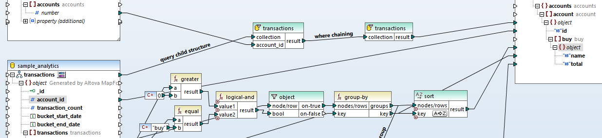 Combining MapForce Where/Order structures with other MapForce built-in functions filters the transactions collection to output only “buy” transactions, and joins the transactions in grouped and sorted format to profiles in the customers collection.