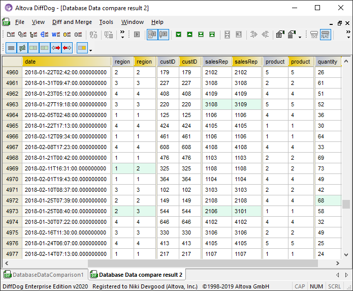 The navigation toolbar at the top lets you quickly locate the first difference between the files. Perhaps an order for customer number 544 was incorrectly entered and needed to be reclassified to a different region and sales rep.