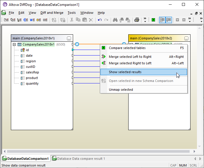 In the screenshot below, the user has selected left and right comparison files, mapped the files at the top level to compare all columns, and executed the comparison by clicking the green Compare tool icon at the top right side of the toolbar.
