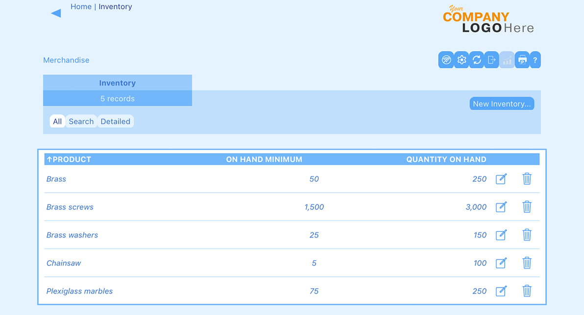 We can validate our changes by navigating back to the demo data and viewing the Inventory list form. Here is the list view with On Hand Minimums and some entirely new product entries Rhonda added: