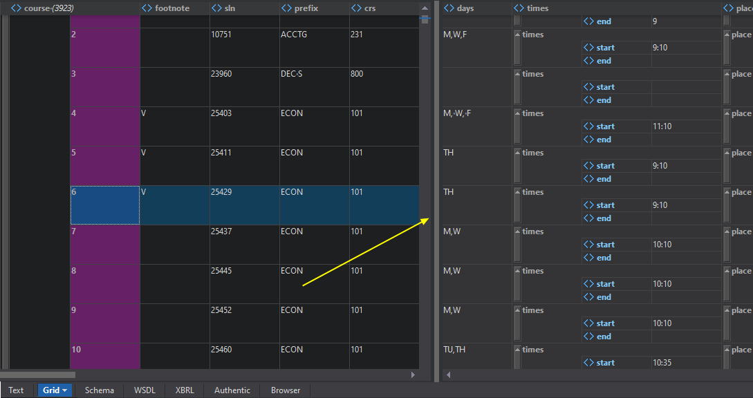 In the screenshot below, we’ve dragged the vertical slider to split this large course catalog XML document into two panes, which can scroll independently as we work. Any changes made in one pane are reflected in the other and the document as a whole.
