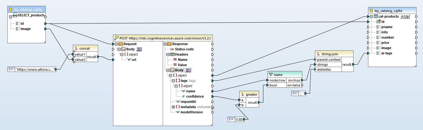 We can create an AI-based data mapping using Altova MapForce to send product images to the Computer Vision AI using its web service API. Altova MapForce is an award-winning, graphical data mapping tool for any-to-any data conversion and integration. The Computer Vision API uses artificial intelligence to analyze each image and return a list of tags. MapForce supports Web services directly within a mapping, and intermediate result processing or chained data mapping functionality can then insert the tags back into a dedicated field in the database for each product.