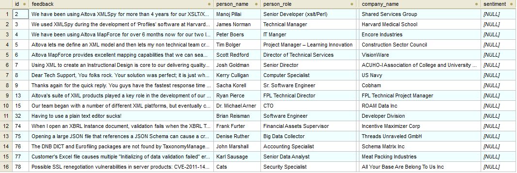 And we have some example data in it that will allow us to run our integration tests in MapForce and determine the sentiment of all these pieces of customer feedback: