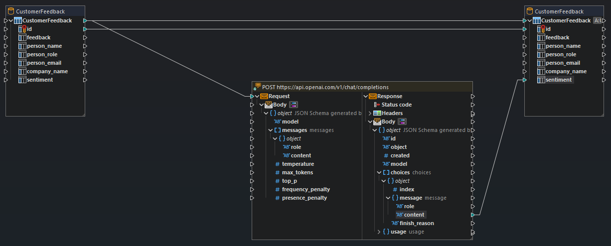 Now we have all the ingredients ready to create our MapForce transformation or ETL project that will read all the records from the database, call the OpenAI API to get the sentiment analysis, and write the results back into the database.