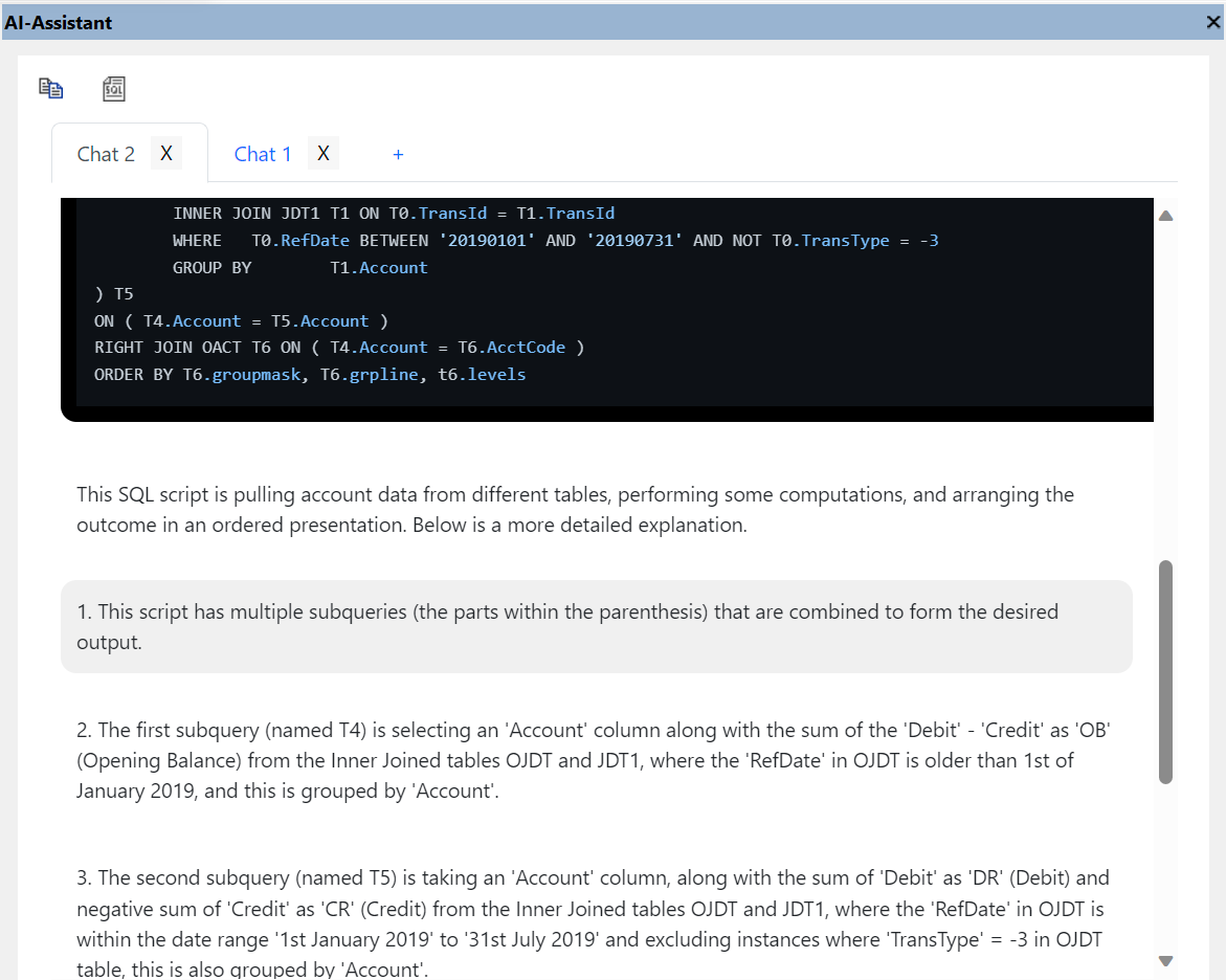 AI Chat Dialog: use ChatGPT integration to create sample SQL statements, create sample data for a given table structure, create relations between tables that have no keys yet, and so on. Once you send a request and receive the response, you can copy and paste the returned SQL into an existing file or create a new SQL file with the response.
