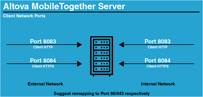 Clients will need to be able to connect both internally and externally. We recommend using the default MobileTogether ports, and remapping them to 80 and 443 at each of your firewalls. This is discussed in greater detail in the video.